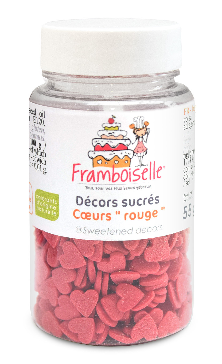 Framboiselle® propose des décors sucrés cœurs rouges dans un pot refermable pour embellir vos gâteaux, biscuits, cupcakes