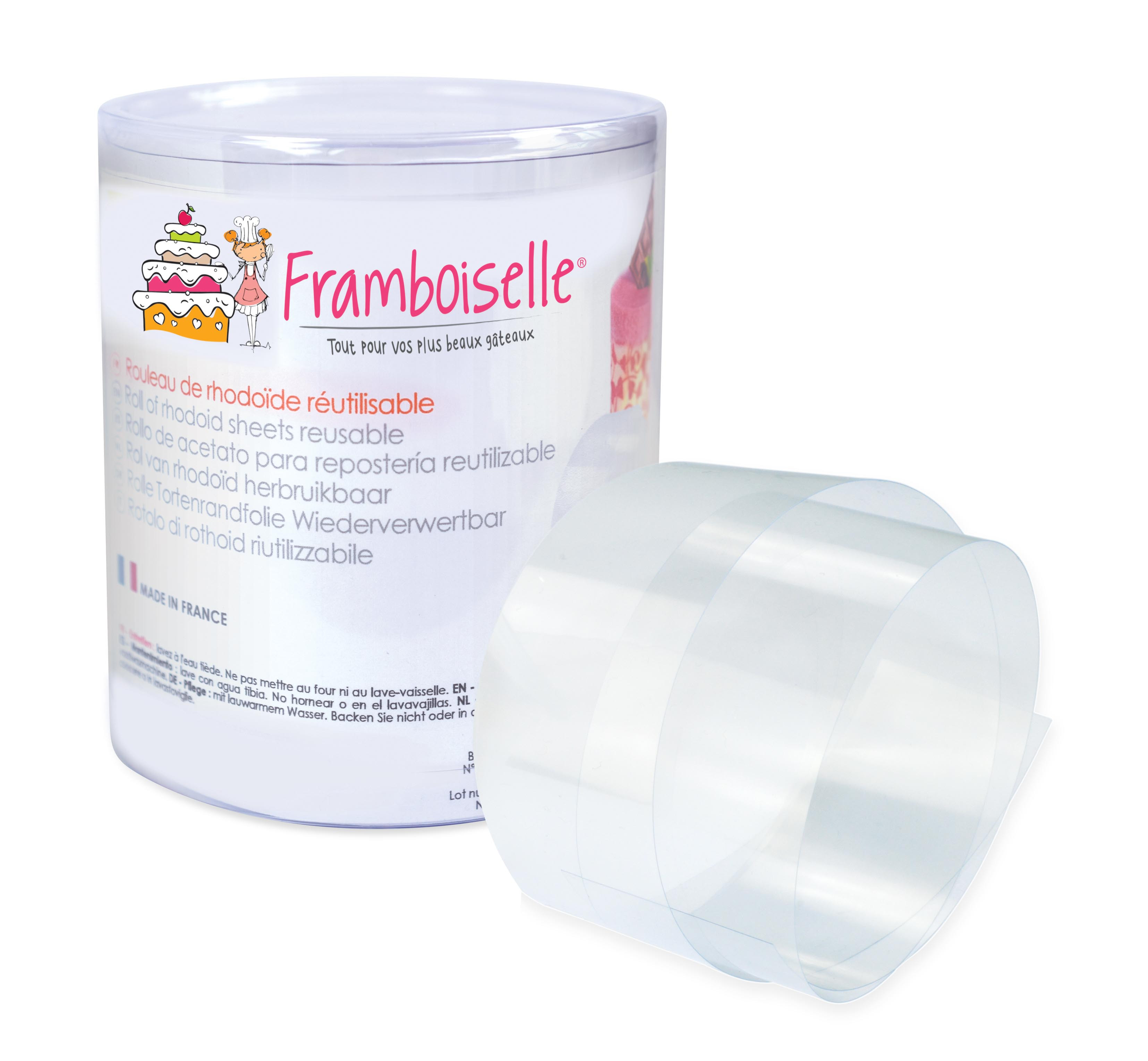 Bande de rhodoïde pour réaliser des entremets et faciliter le démoulage dans les cadres et cercles à pâtisserie. Dimensions : 1 bande de 3 mètres, H 8 cm.