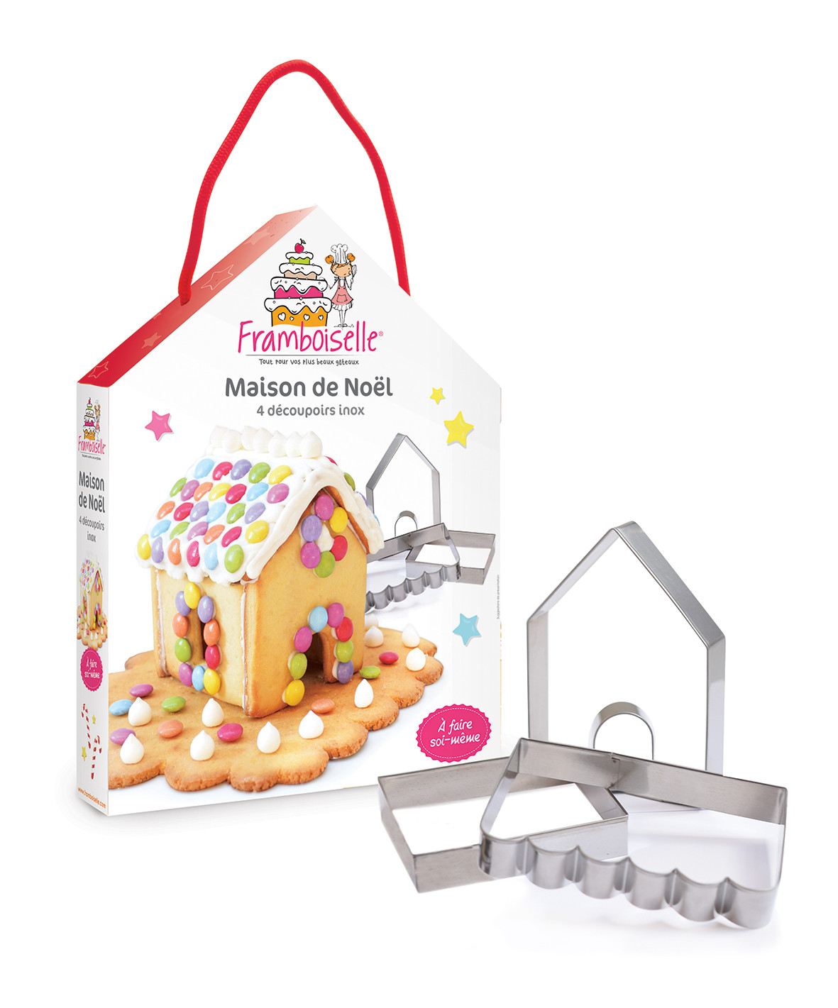 Kit de 4 découpoirs en inox pour réaliser sa maison de Noël en biscuits et la décorer. Présenté dans un joli packaging en forme de maison, ce kit contient également une recette de biscuits.