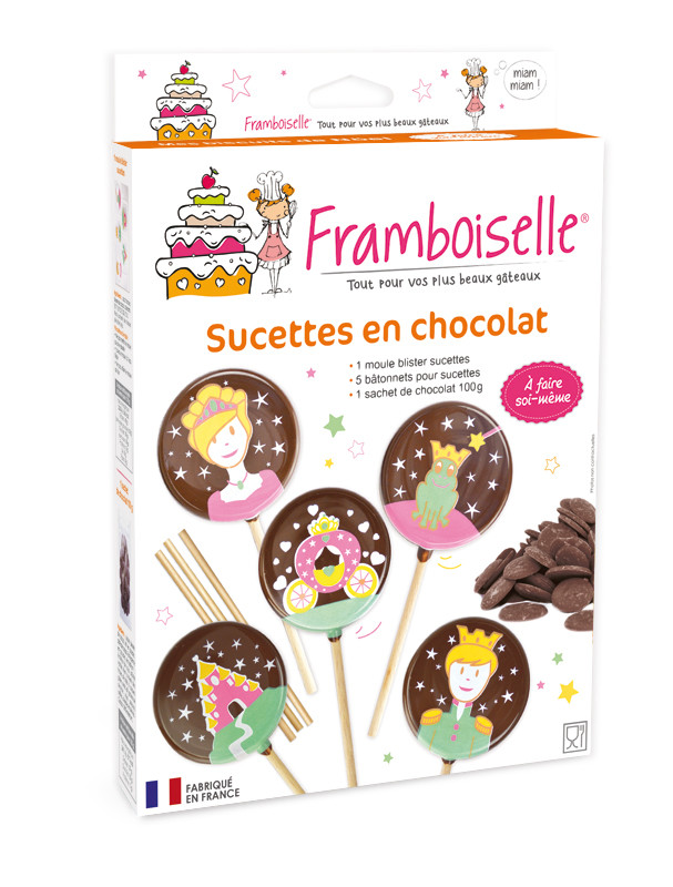 Kit mes sucettes pour réaliser 5 sucettes avec ses enfants ! Kit contenant: 1 moule blister 5 sucettes, 5 bâtonnets et 100 gr de chocolat.
