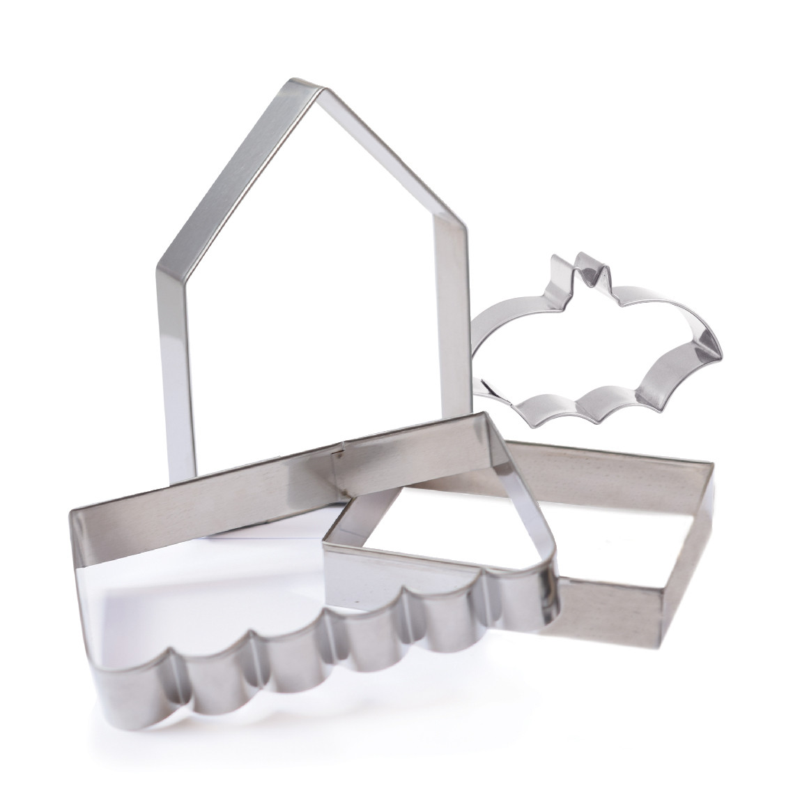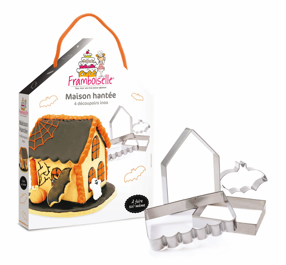 Kit de 4 découpoirs en inox pour réaliser une maison hantée et l'agrémenter de biscuits chauve-souris. Présenté dans une jolie boîte en forme de maison avec la recette. Parfait pour occuper vos enfants pendant Halloween !