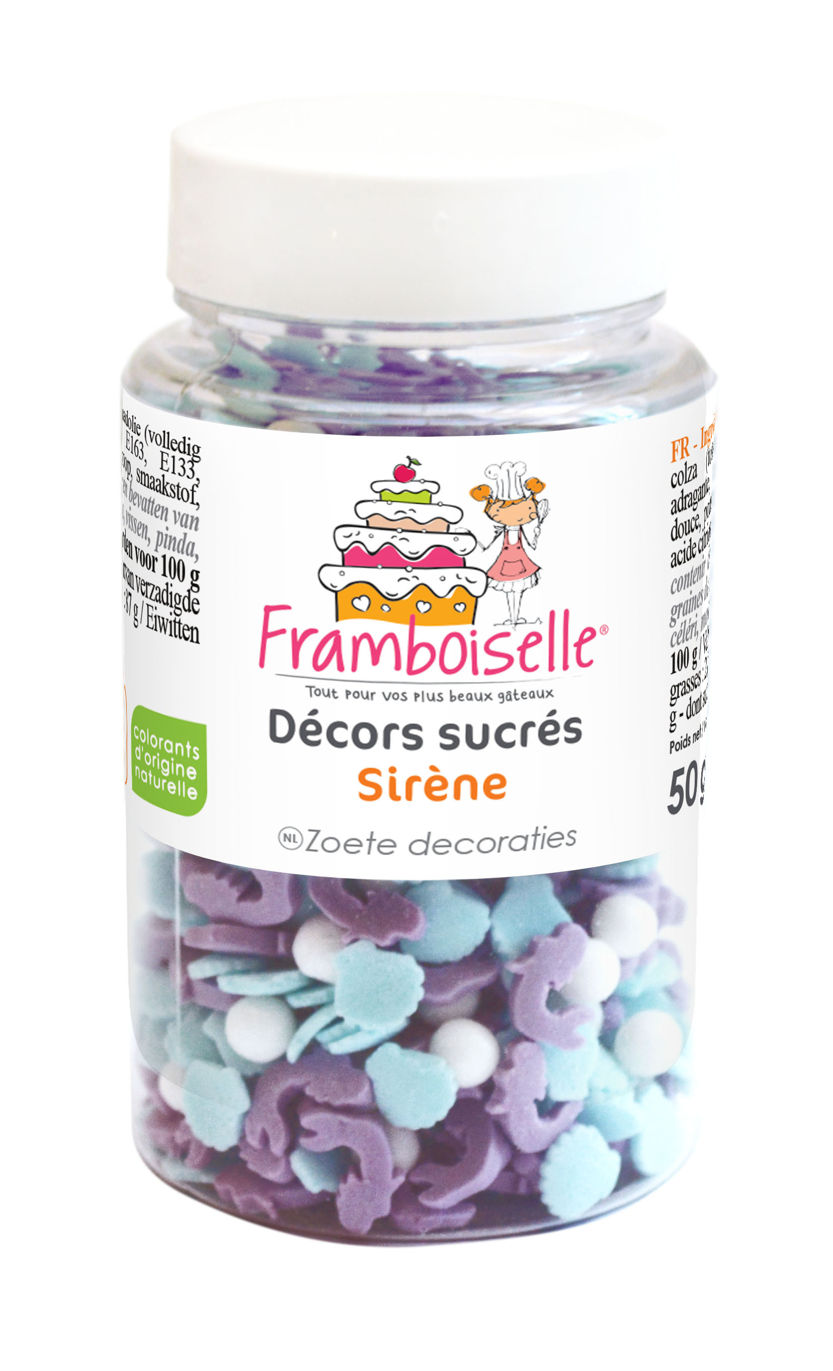 Framboiselle® propose des décors sucrés Sirène dans un pot refermable pour embellir vos gâteaux, biscuits, cupcakes…