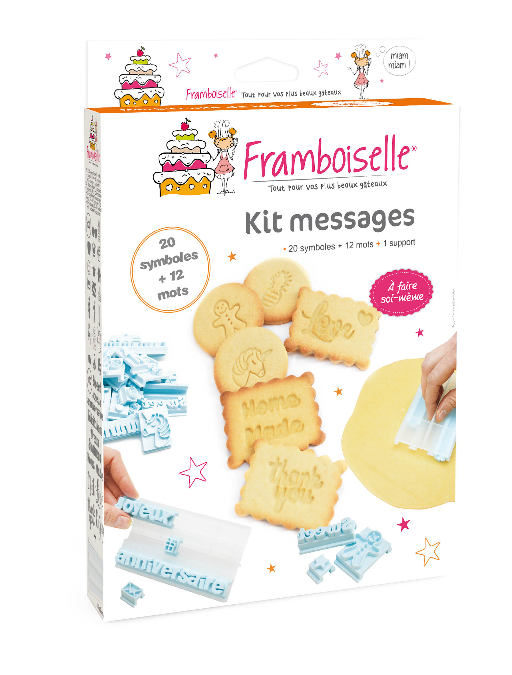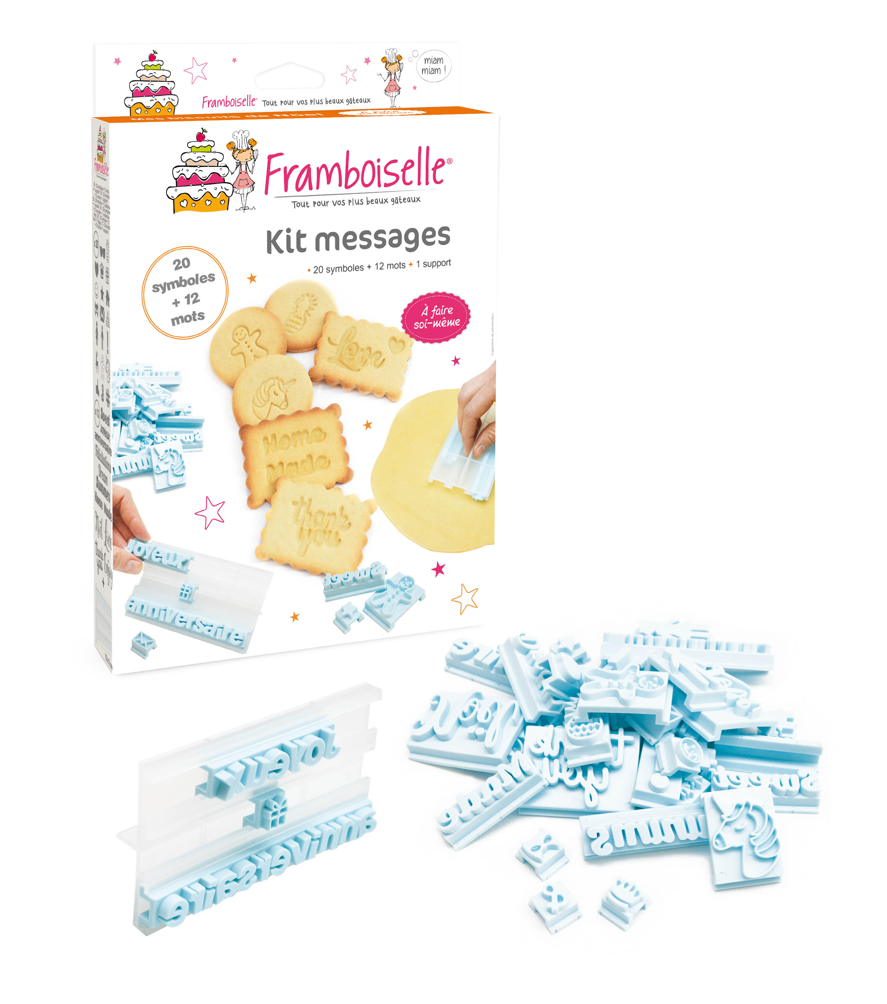 Grâce aux 20 formes et 12 mots proposés dans ce kit, glissez un message sur vos gâteaux en laissant une empreinte sur de la pâte à sucre ou encore dans une pâte à biscuit. Noël, anniversaire, mots doux …ce kit vous servira tout au long de l'année !